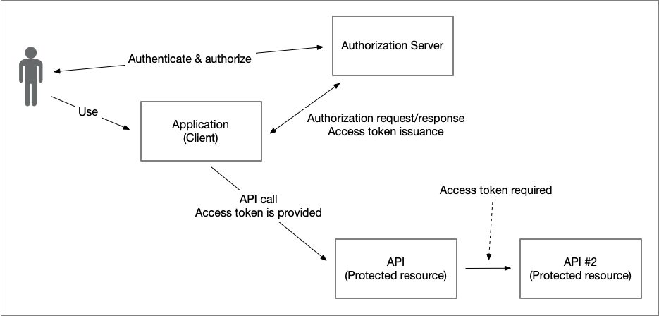 The simple illustration below shows a typical use of the OAuth 2.0 authorization code grant, where an application (OAuth 2.0 client) obtains an access token from the authorization server to access an API (protected resource) on behalf of a user interacting with the application.